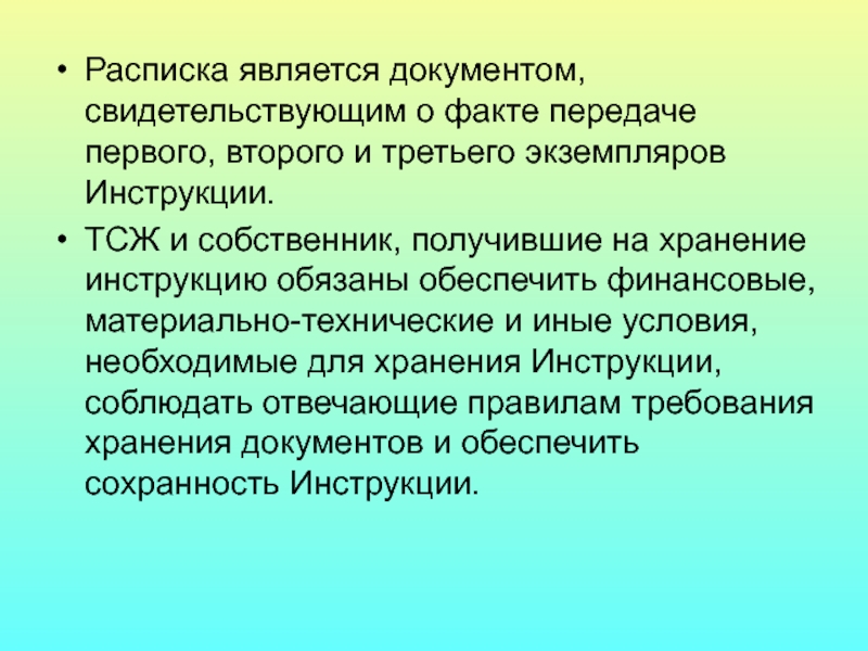 ТСЖ и собственник, получившие на хранение инструкцию обязаны обеспечить финансовые, материально-технические и иные условия, необходимые для хранения Инструкции, соблюдать отвечающие правилам требования хранения документов и обеспечить сохранность Инструкции.