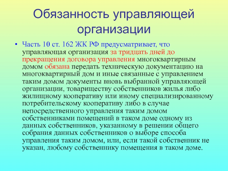 Часть 10 ст. 162 ЖК РФ предусматривает, что управляющая