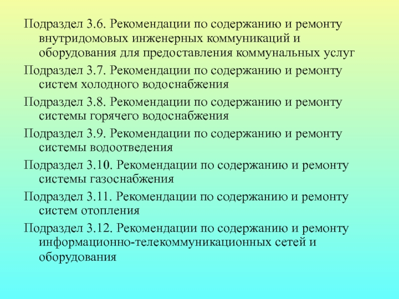Слайд 28Подраздел 3.6. Рекомендации по содержанию и ремонту внутридомовых инженерных коммуникаций и