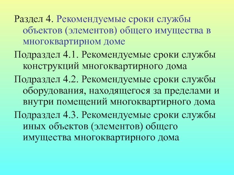 Слайд 31Раздел 4. Рекомендуемые сроки службы объектов (элементов) общего имущества в многоквартирном