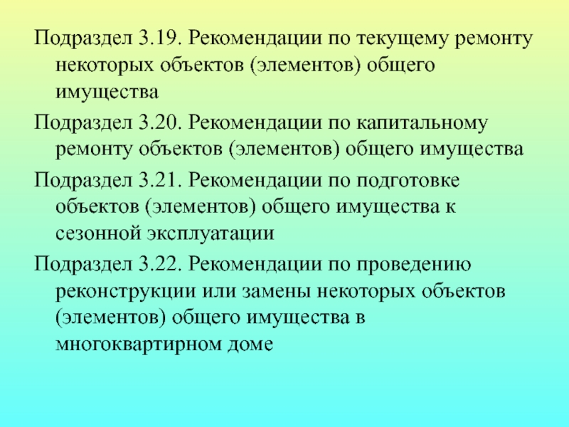 Слайд 30Подраздел 3.19. Рекомендации по текущему ремонту некоторых объектов (элементов) общего имущества