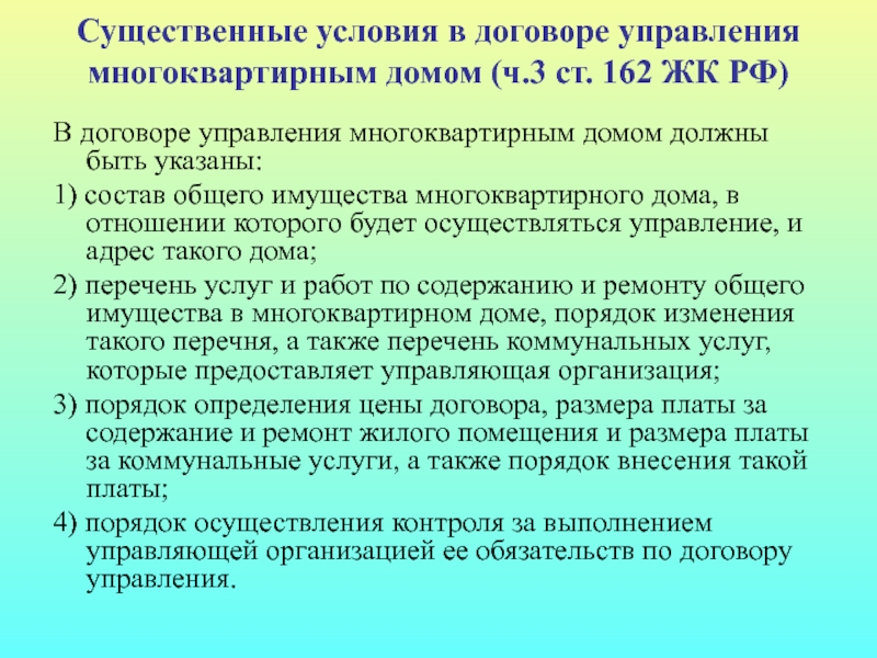 Слайд 6Существенные условия в договоре управления многоквартирным домом (ч.3 ст. 162 ЖК