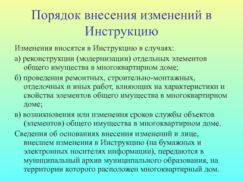 Сведения об основаниях внесения изменений и лице, внесшем изменения в Инструкцию (на бумажных и электронных носителях информации), передаются в муниципальный архив муниципального образования, на территории которого расположен многоквартирный дом.