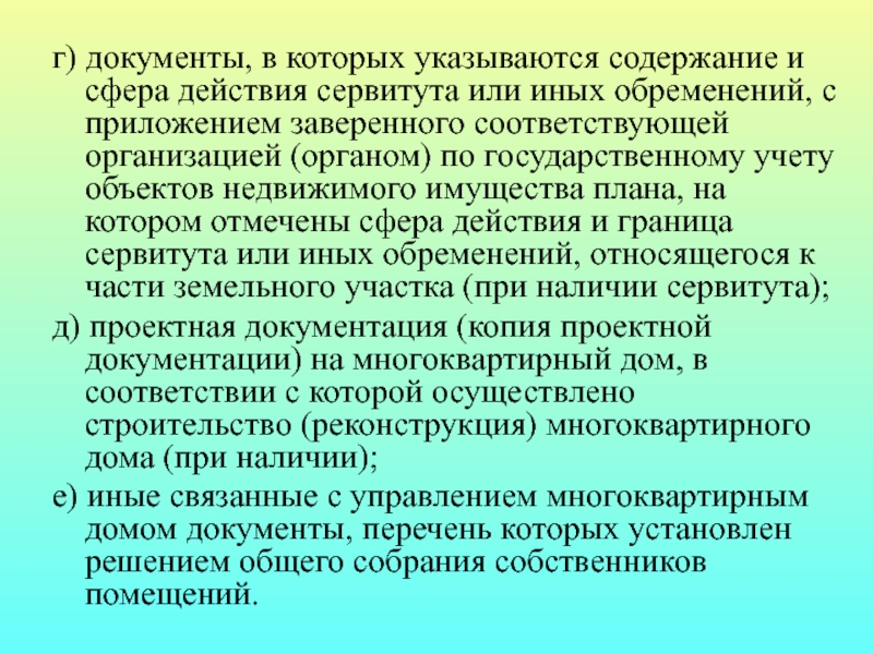 Слайд 12г) документы, в которых указываются содержание и сфера действия сервитута или иных