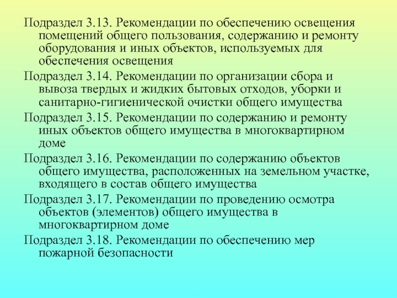 Слайд 29Подраздел 3.13. Рекомендации по обеспечению освещения помещений общего пользования, содержанию и