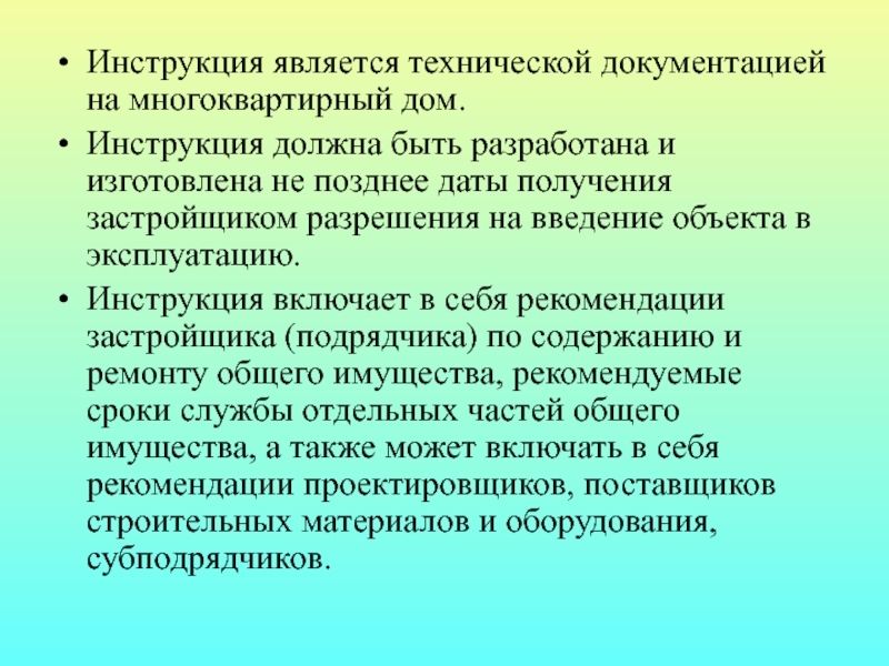 Инструкция включает в себя рекомендации застройщика (подрядчика) по содержанию и ремонту общего имущества, рекомендуемые сроки службы отдельных частей общего имущества, а также может включать в себя рекомендации проектировщиков, поставщиков строительных материалов и оборудования, субподрядчиков.