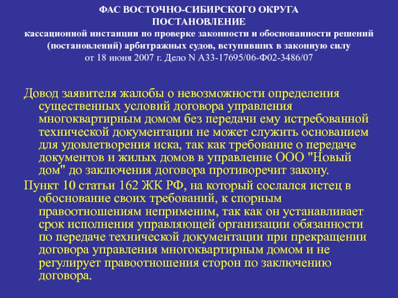Пункт 10 статьи 162 ЖК РФ, на который сослался истец в обоснование своих требований, к спорным правоотношениям неприменим, так как он устанавливает срок исполнения управляющей организации обязанности по передаче технической документации при прекращении договора управления многоквартирным домом и не регулирует правоотношения сторон по заключению договора.