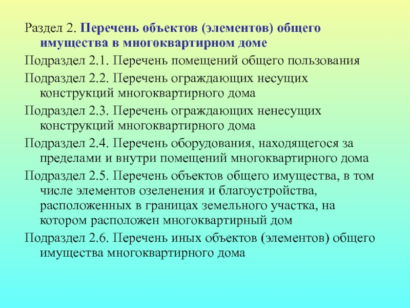 Слайд 26Раздел 2. Перечень объектов (элементов) общего имущества в многоквартирном доме