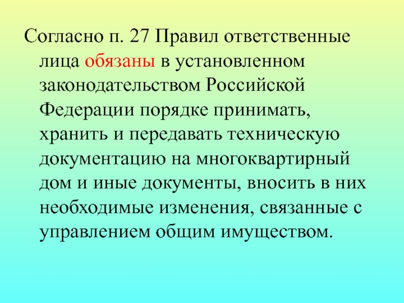 Слайд 8Согласно п. 27 Правил ответственные лица обязаны в установленном законодательством Российской Федерации