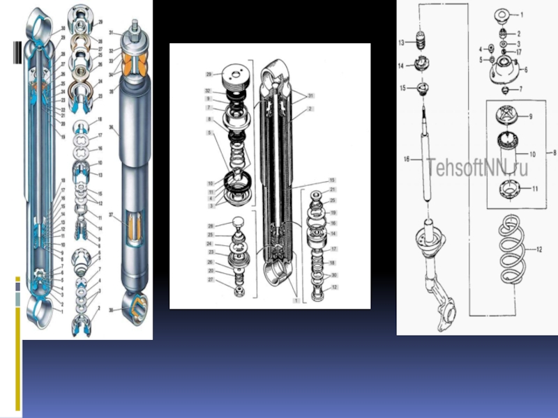 Металлические пружины и рессоры это упругие элементы в «чистом» виде. Узлы и детали, в конструкции которых есть резина, отдельные виды пластиков и т.п., неправильно считать только упругими, так как при работе подвески часть энергии колебаний тратится на внутреннее трение в материале этих деталей. Таковы сайлент-блоки, резиновые буферы и т.д. Амортизаторы (по крайней мере, большинство конструкций) это гасители колебаний, предназначенные для того, чтобы не дать колебаниям развиться до опасных величин.