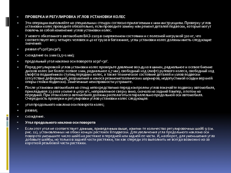 Слайд 5ПРОВЕРКА И РЕГУЛИРОВКА УГЛОВ УСТАНОВКИ КОЛЕС