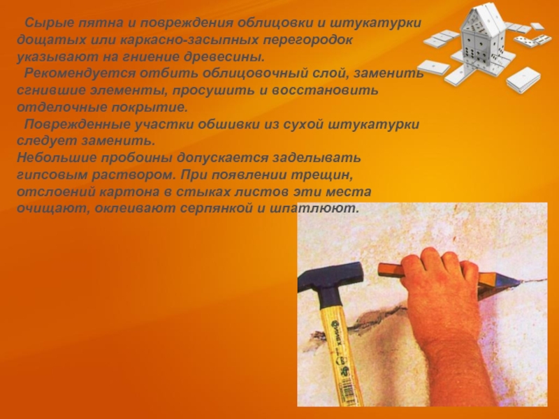 Слайд 22 Сырые пятна и повреждения облицовки и штукатурки дощатых или каркасно-засыпных