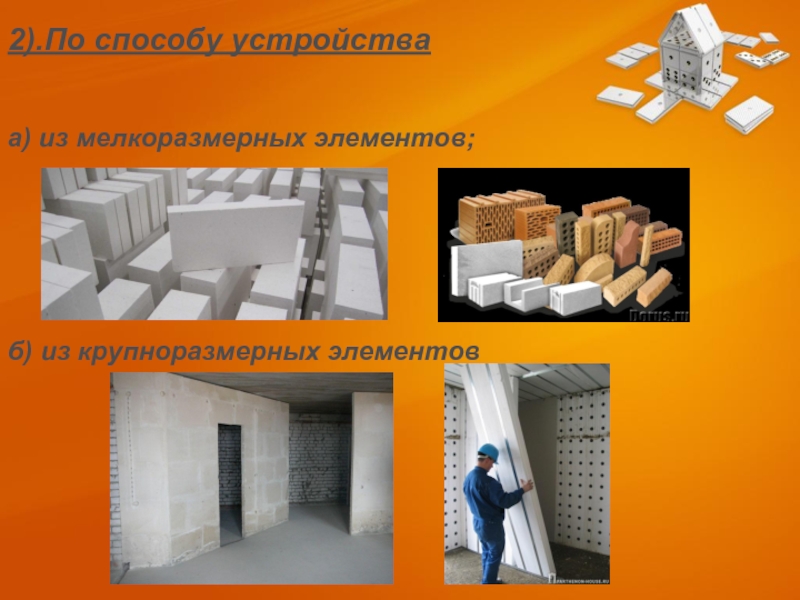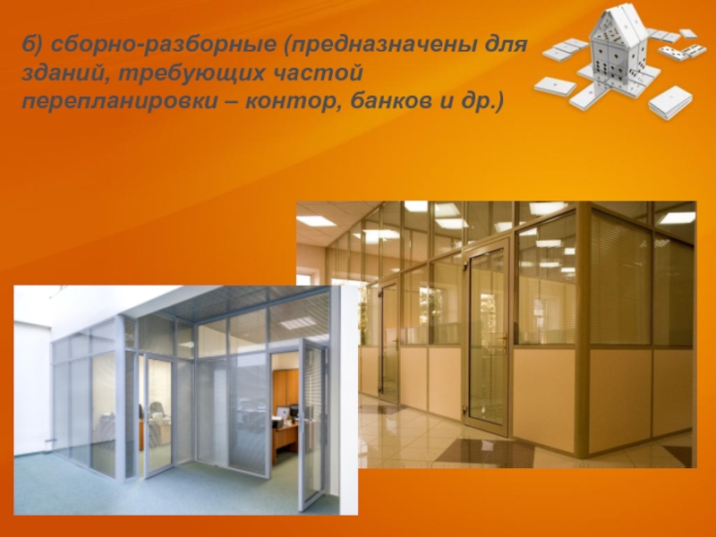 Слайд 12б) сборно-разборные (предназначены для зданий, требующих частой перепланировки – контор, банков