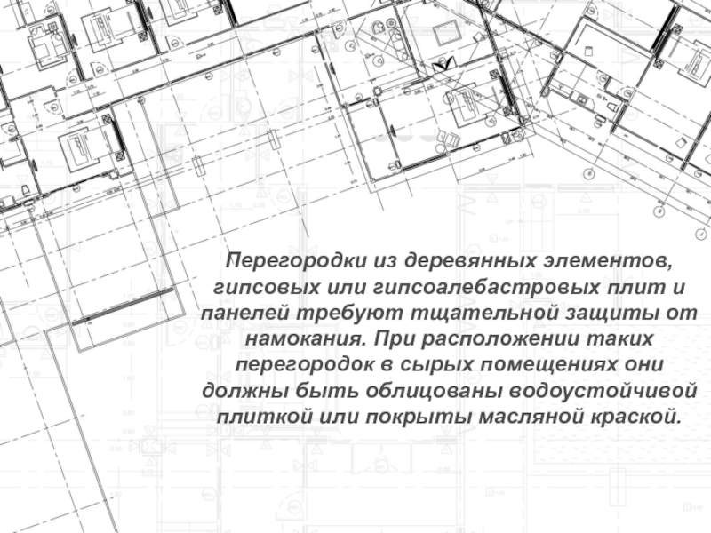 Слайд 23Перегородки из деревянных элементов, гипсовых или гипсоалебастровых плит и панелей требуют
