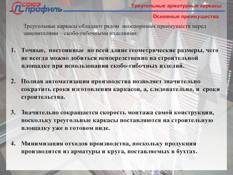 Точные, постоянные по всей длине геометрические размеры, чего не всегда можно добиться непосредственно на строительной площадке при использовании скобо-гибочных изделий.
