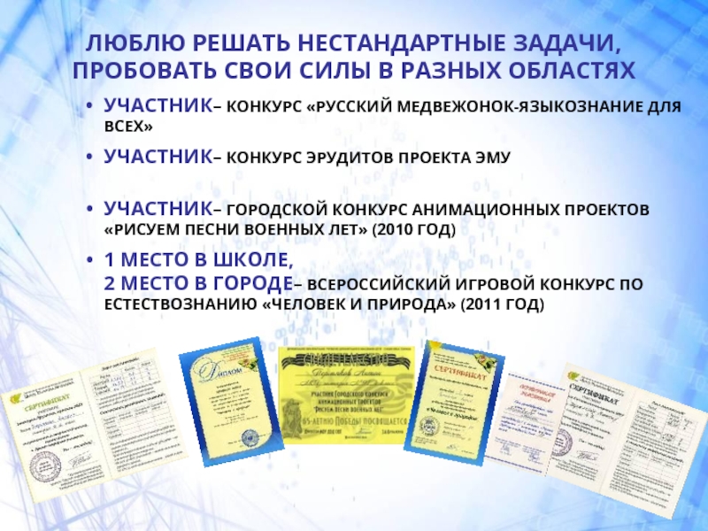 2 МЕСТО В ГОРОДЕ– ВСЕРОССИЙСКИЙ ИГРОВОЙ КОНКУРС ПО ЕСТЕСТВОЗНАНИЮ «ЧЕЛОВЕК И ПРИРОДА» (2011 ГОД)