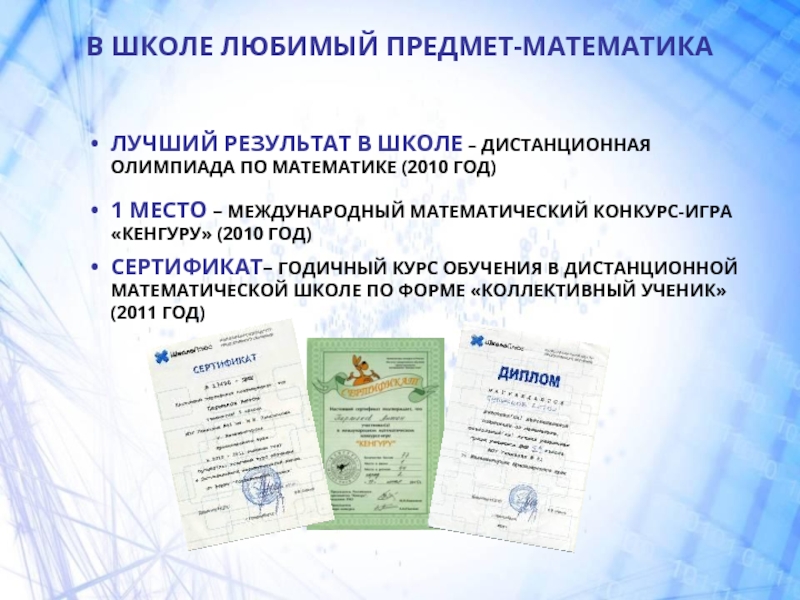 СЕРТИФИКАТ– ГОДИЧНЫЙ КУРС ОБУЧЕНИЯ В ДИСТАНЦИОННОЙ МАТЕМАТИЧЕСКОЙ ШКОЛЕ ПО ФОРМЕ «КОЛЛЕКТИВНЫЙ УЧЕНИК» (2011 ГОД)