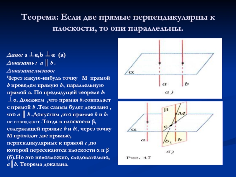Проведем какую-нибудь прямую х в плоскости α. Так как а перпендикулярна α, то а перпендикулярна х. По лемме о перпендикулярности двух параллельных прямых к третьей а1 перпендикулярна х. Таким образом, прямая а1 перпендикулярна к любой прямой, лежащей в плоскости α, т.е. а1 перпендикулярна α. Теорема доказана.