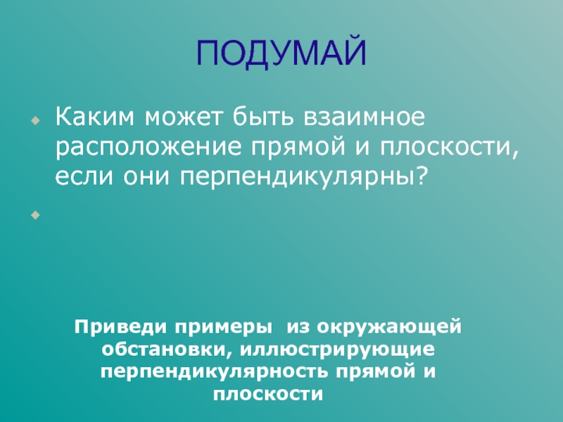 Приведи примеры из окружающей обстановки, иллюстрирующие перпендикулярность прямой и плоскости