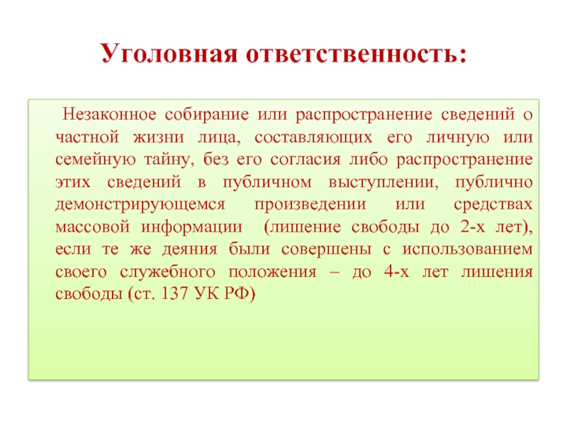 его личную или семейную тайну, без его согласия либо распространение этих сведений в публичном выступлении, публично демонстрирующемся произведении или средствах массовой информации (лишение свободы до 2-х лет), если те же деяния были совершены с использованием своего служебного положения – до 4-х лет лишения свободы (ст. 137 УК РФ)