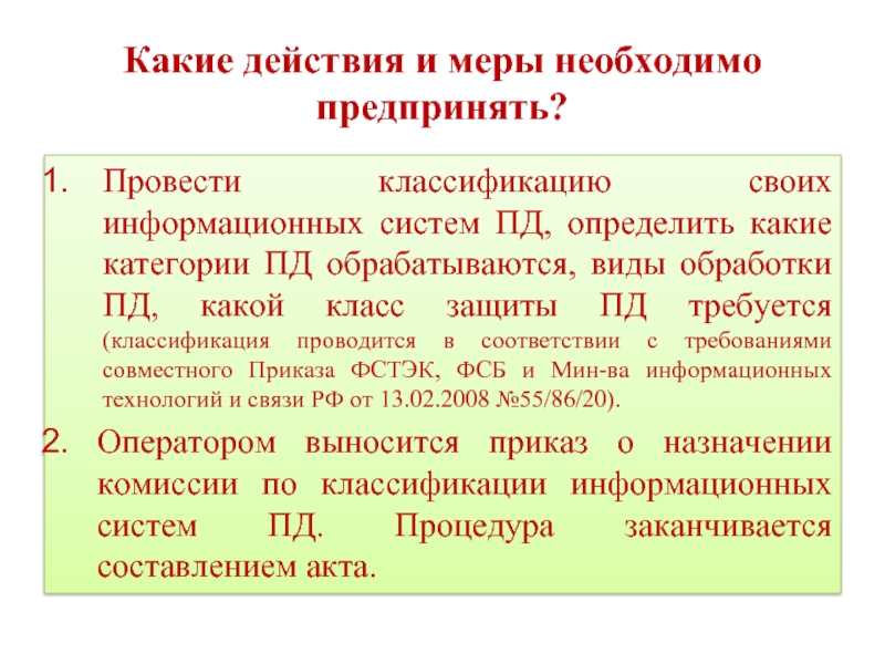 определить какие категории ПД обрабатываются, виды обработки ПД, какой класс защиты ПД требуется (классификация проводится в соответствии с требованиями совместного Приказа ФСТЭК, ФСБ и Мин-ва информационных технологий и связи РФ от 13.02.2008 №55/86/20).