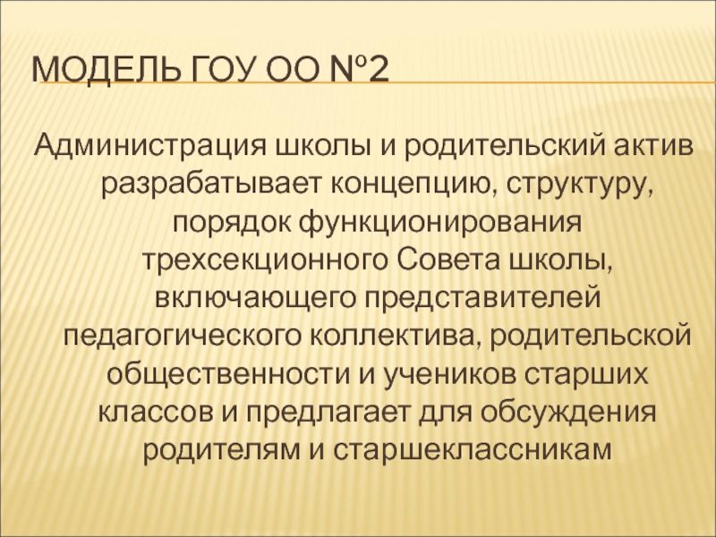 порядок функционирования трехсекционного Совета школы, включающего представителей педагогического коллектива, родительской общественности и учеников старших классов и предлагает для обсуждения родителям и старшеклассникам