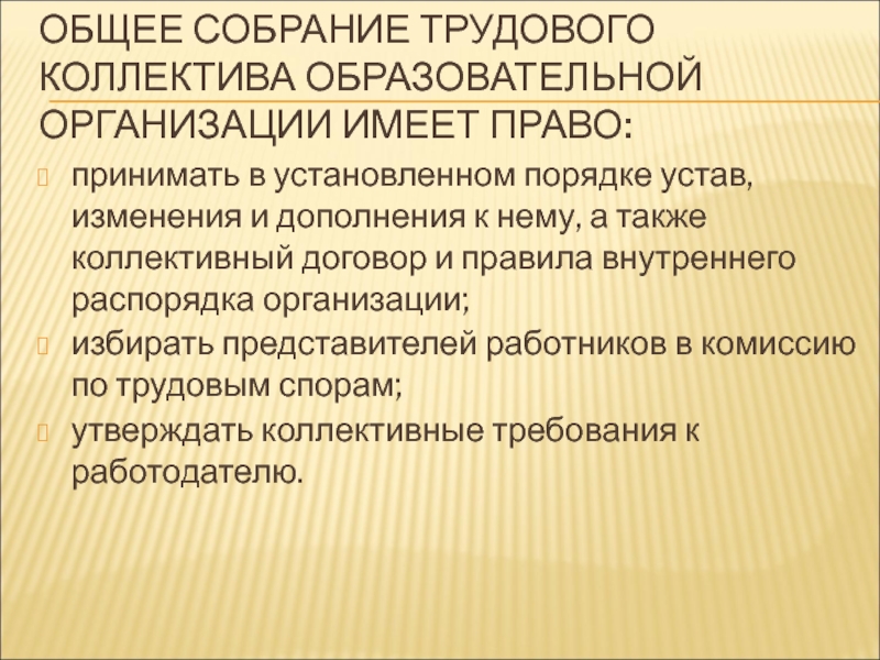 Слайд 34ОБЩЕЕ СОБРАНИЕ ТРУДОВОГО КОЛЛЕКТИВА ОБРАЗОВАТЕЛЬНОЙ ОРГАНИЗАЦИИ ИМЕЕТ ПРАВО: