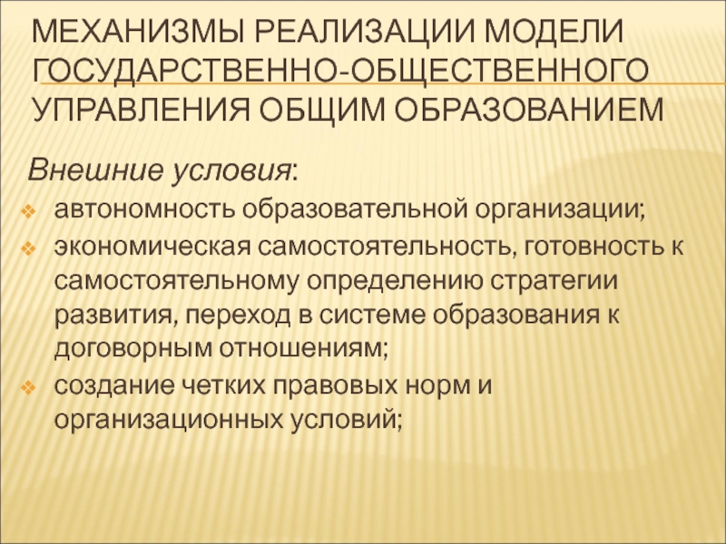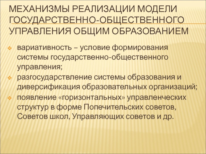 Слайд 44МЕХАНИЗМЫ РЕАЛИЗАЦИИ МОДЕЛИ ГОСУДАРСТВЕННО-ОБЩЕСТВЕННОГО УПРАВЛЕНИЯ ОБЩИМ ОБРАЗОВАНИЕМ