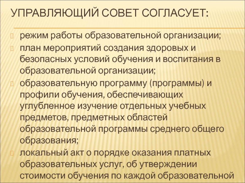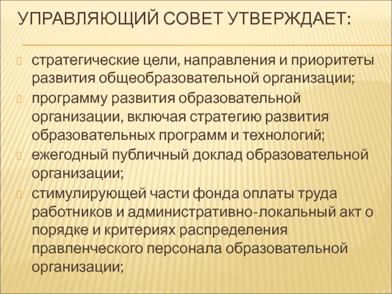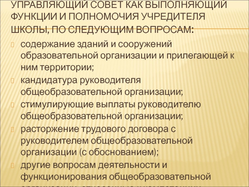 Слайд 28УПРАВЛЯЮЩИЙ СОВЕТ КАК ВЫПОЛНЯЮЩИЙ ФУНКЦИИ И ПОЛНОМОЧИЯ УЧРЕДИТЕЛЯ ШКОЛЫ, ПО СЛЕДУЮЩИМ