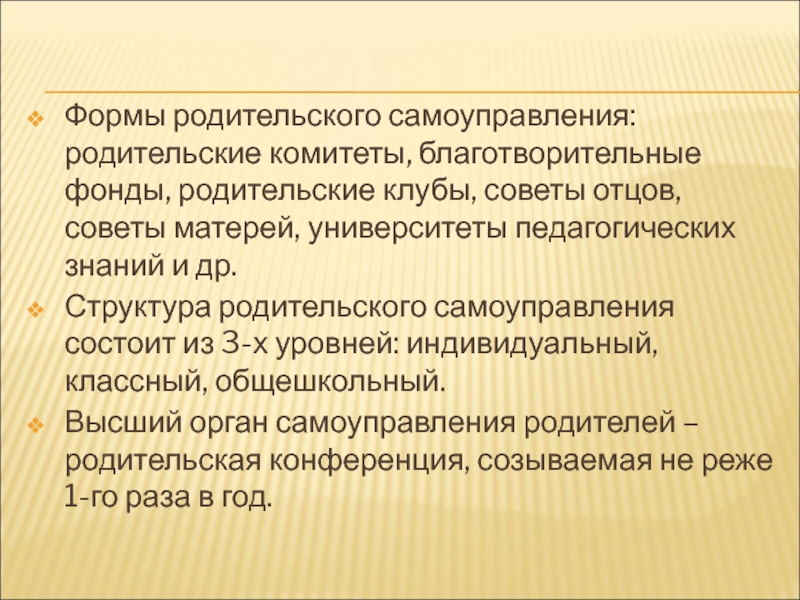 Слайд 33Формы родительского самоуправления: родительские комитеты, благотворительные фонды, родительские клубы, советы отцов,