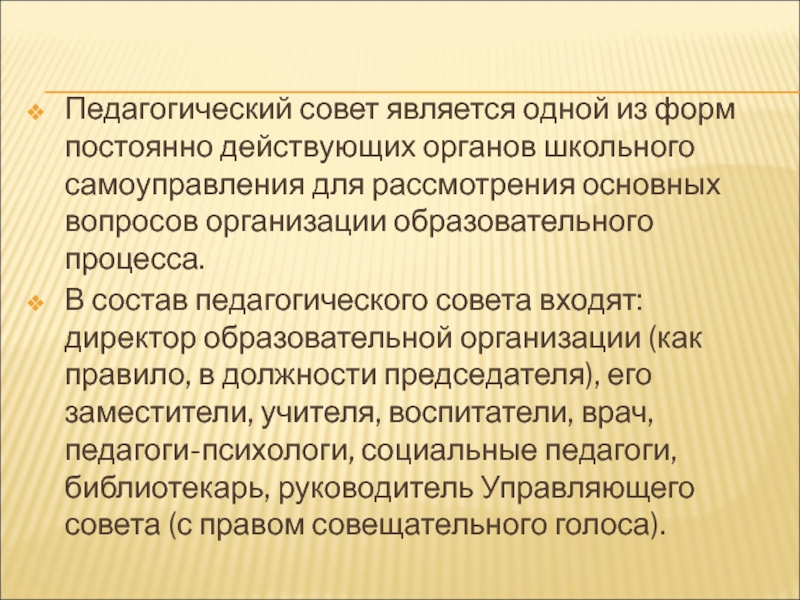 Слайд 32Педагогический совет является одной из форм постоянно действующих органов школьного самоуправления