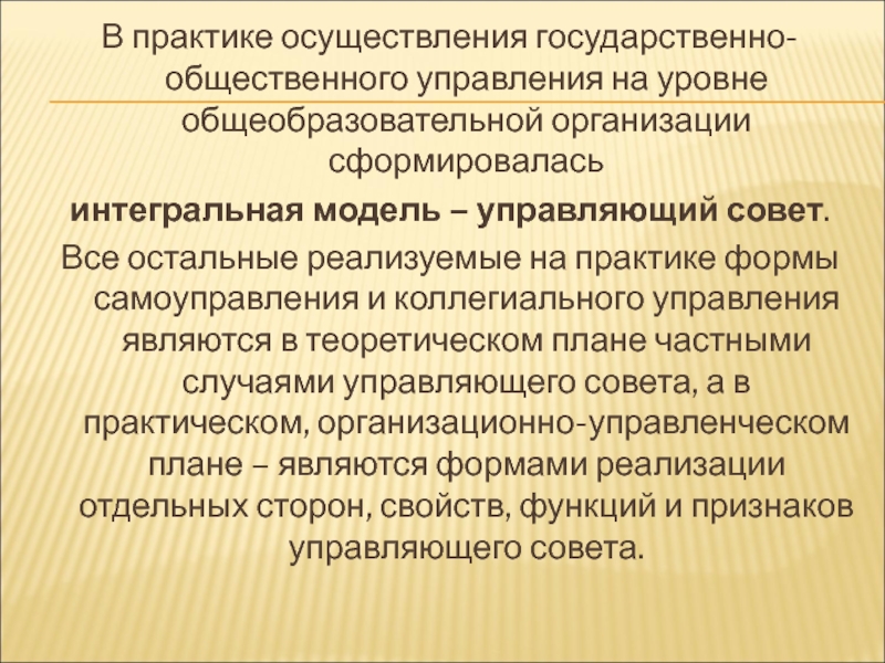 Все остальные реализуемые на практике формы самоуправления и коллегиального управления являются в теоретическом плане частными случаями управляющего совета, а в практическом, организационно-управленческом плане – являются формами реализации отдельных сторон, свойств, функций и признаков управляющего совета.