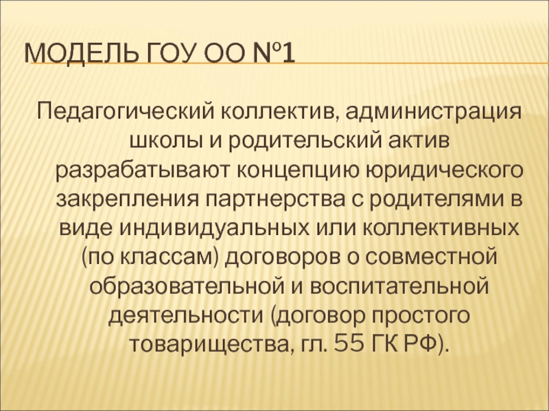 концепцию юридического закрепления партнерства с родителями в виде индивидуальных или коллективных (по классам) договоров о совместной образовательной и воспитательной деятельности (договор простого товарищества, гл. 55 ГК РФ).