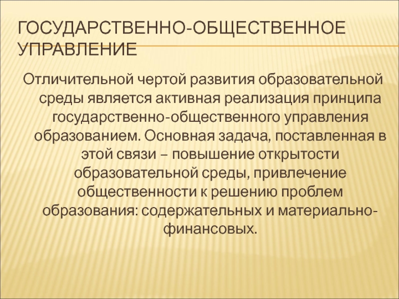 Отличительной чертой развития образовательной среды является активная реализация принципа государственно-общественного