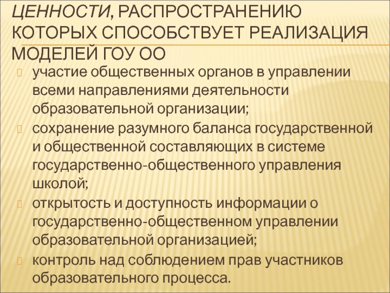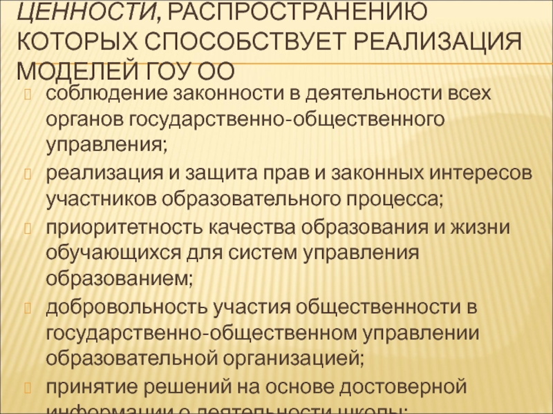 Слайд 19ЦЕННОСТИ, РАСПРОСТРАНЕНИЮ КОТОРЫХ СПОСОБСТВУЕТ РЕАЛИЗАЦИЯ МОДЕЛЕЙ ГОУ ОО