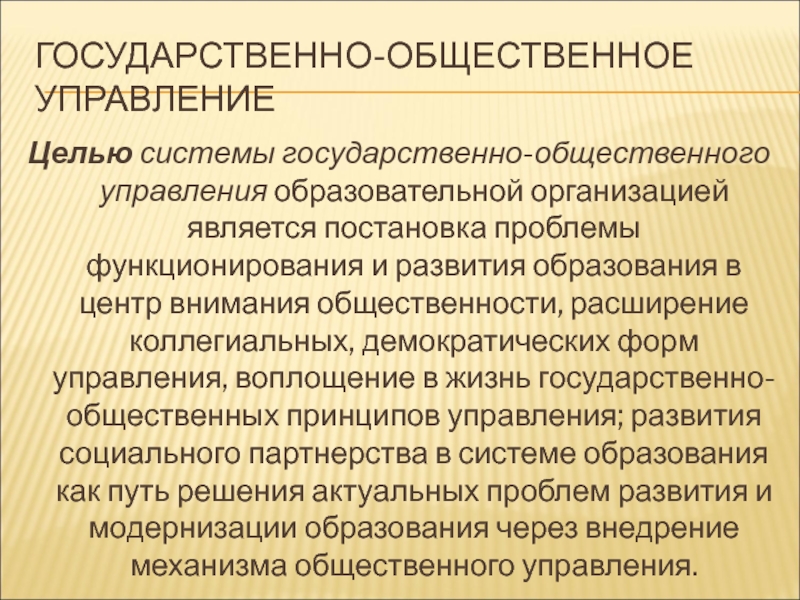 Целью системы государственно-общественного управления образовательной организацией является постановка проблемы функционирования