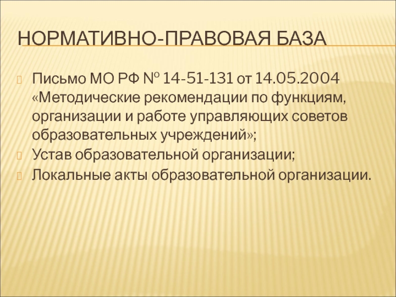 Письмо МО РФ № 22-06-1024 от 03.08.2004 г. «Об активизации государственно-общественного управления образовательным учреждением»;