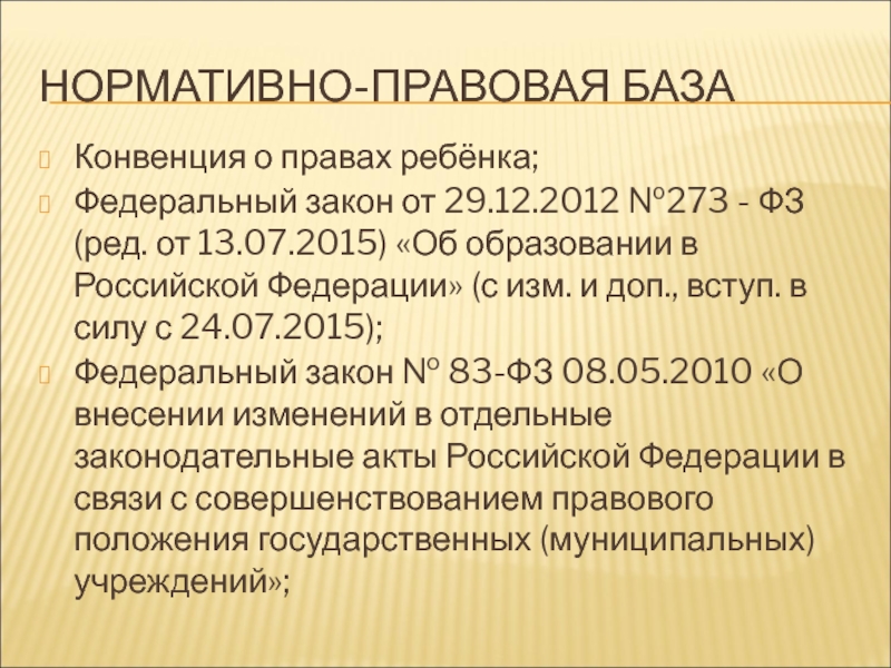 ФЗ (ред. от 13.07.2015) «Об образовании в Российской Федерации» (с изм. и доп., вступ. в силу с 24.07.2015);