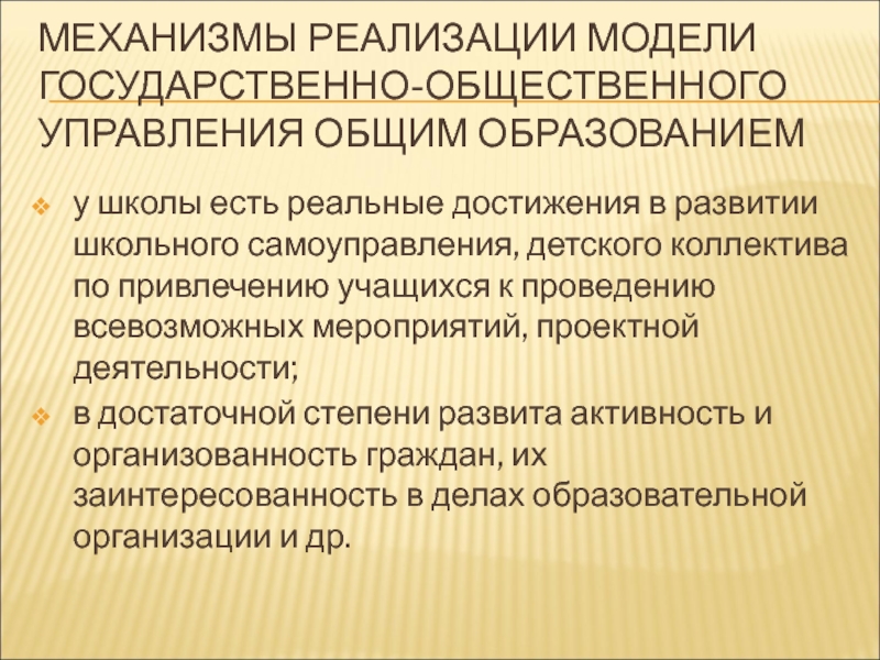 Слайд 45МЕХАНИЗМЫ РЕАЛИЗАЦИИ МОДЕЛИ ГОСУДАРСТВЕННО-ОБЩЕСТВЕННОГО УПРАВЛЕНИЯ ОБЩИМ ОБРАЗОВАНИЕМ