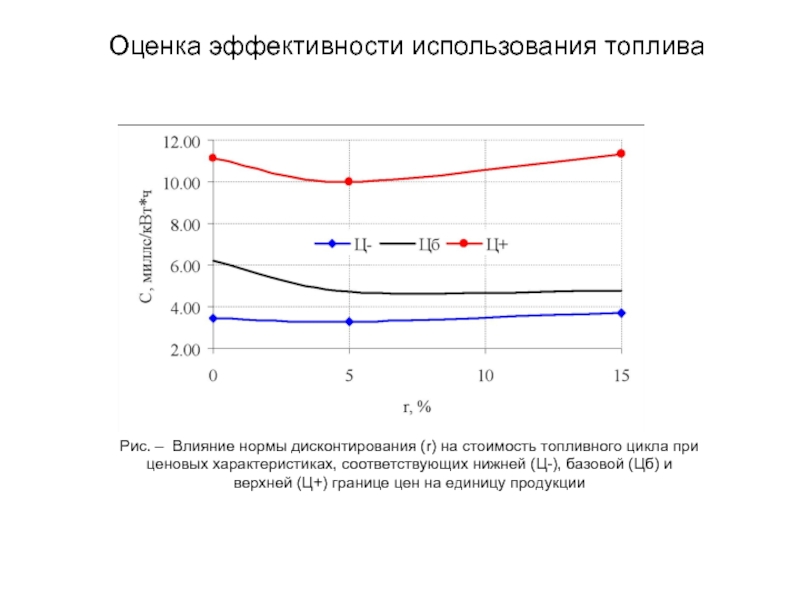 - эксплуатация энергоблока с полуторагодичным циклом перегрузок приводит к повышению топливной составляющей стоимости относительно «базовой», на ~ 22 ÷ 27 %. При этом вне зависимости от ценового диапазона наблюдается рост относительного проигрыша с увеличением нормы дисконтирования, что объясняется значительным вкладом в формирование стоимости издержек начального этапа топливного цикла.