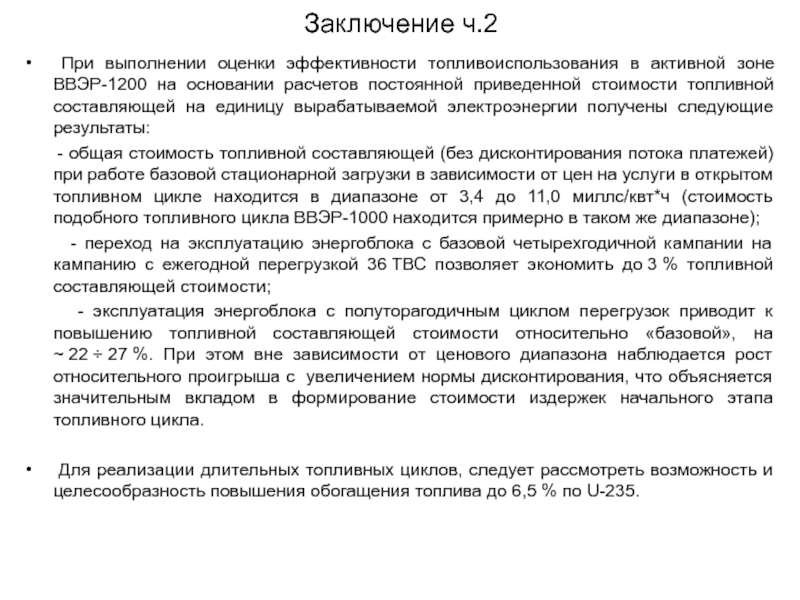 Для реализации длительных топливных циклов, следует рассмотреть возможность и целесообразность повышения обогащения топлива до 6,5 % по U-235.