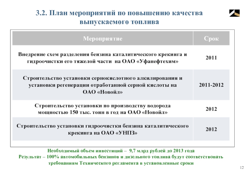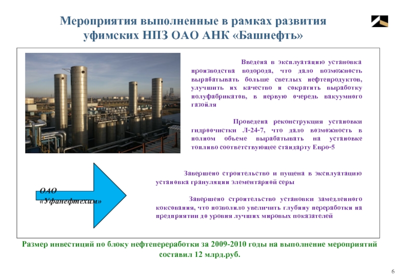 Размер инвестиций по блоку нефтепереработки за 2009-2010 годы на выполнение мероприятий составил 12 млрд.руб.