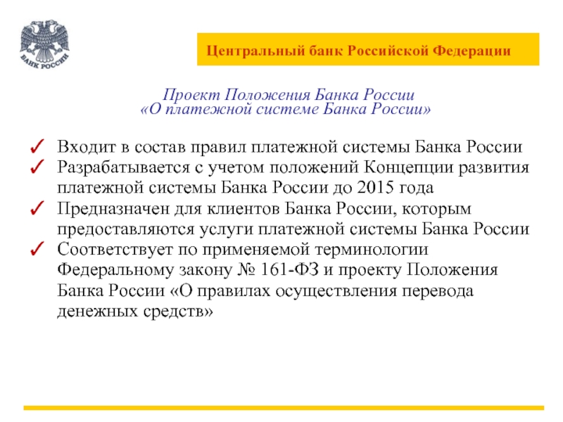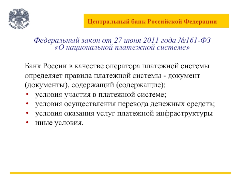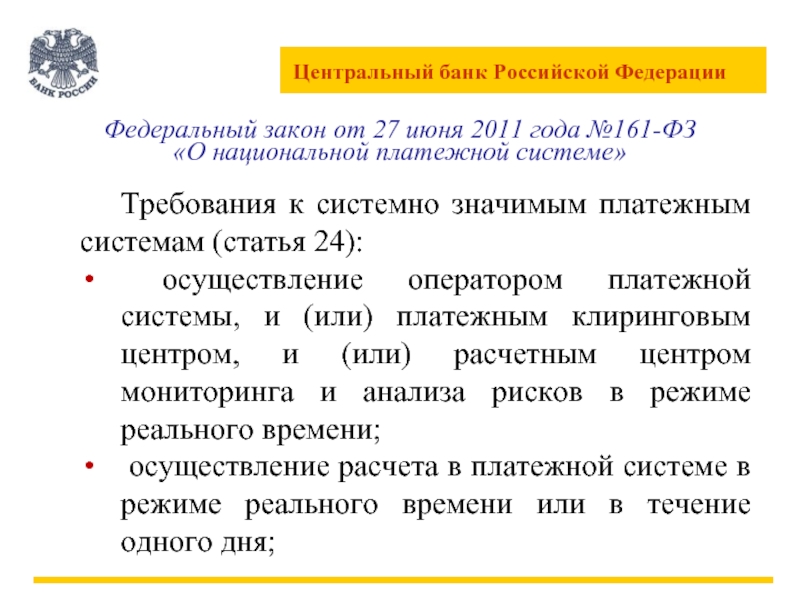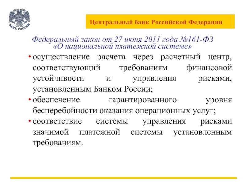 Федеральный закон «О национальной платежной системе» определяет требования к каждой из выше указанных организаций, следовательно и к Банку России, совмещающему свою деятельность как оператора платежной системы с деятельностью оператора по переводу денежных средств, оператора услуг платежной инфраструктуры.