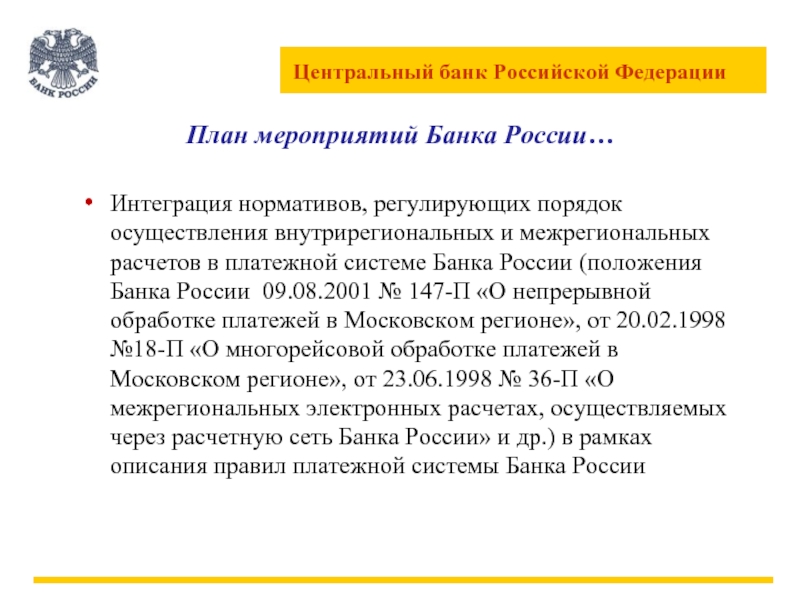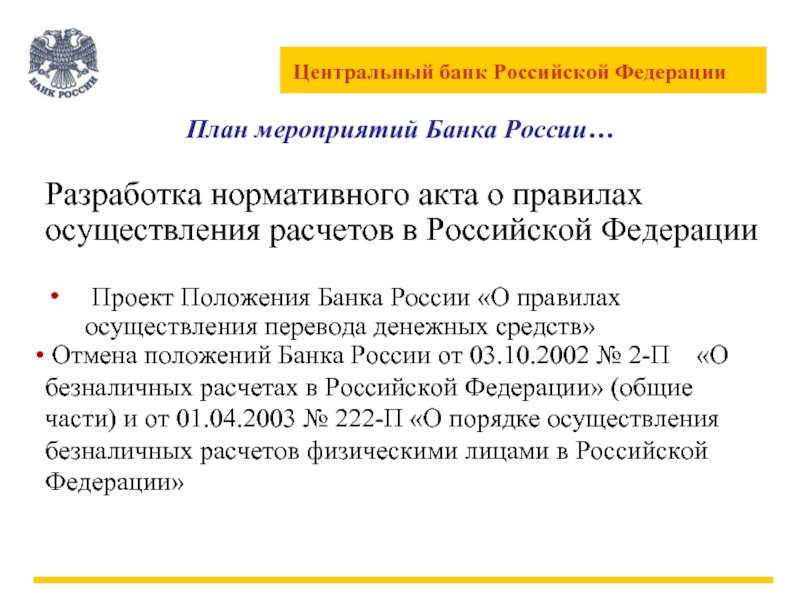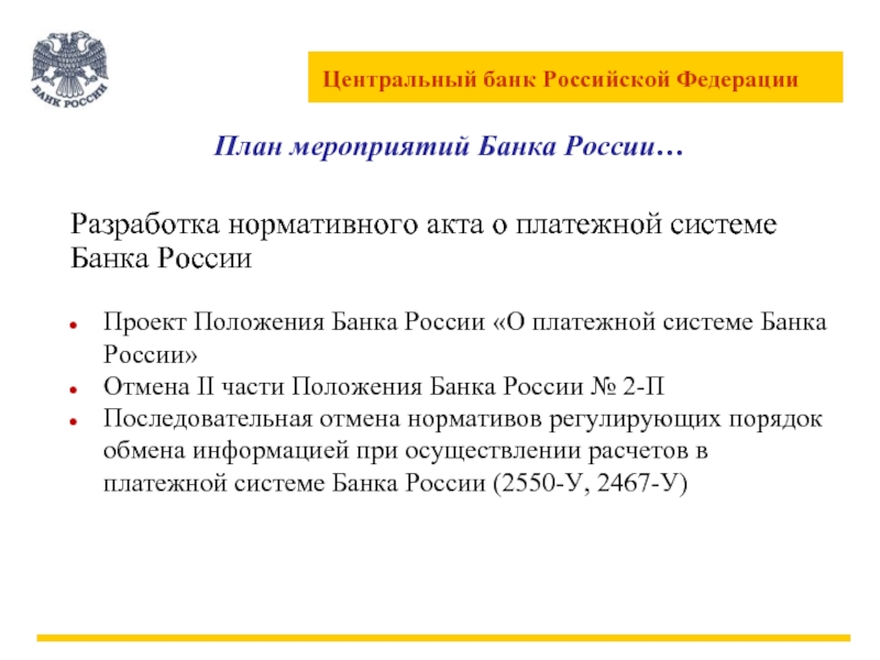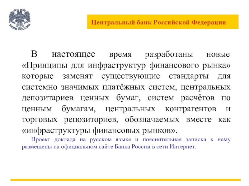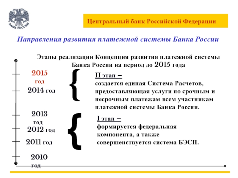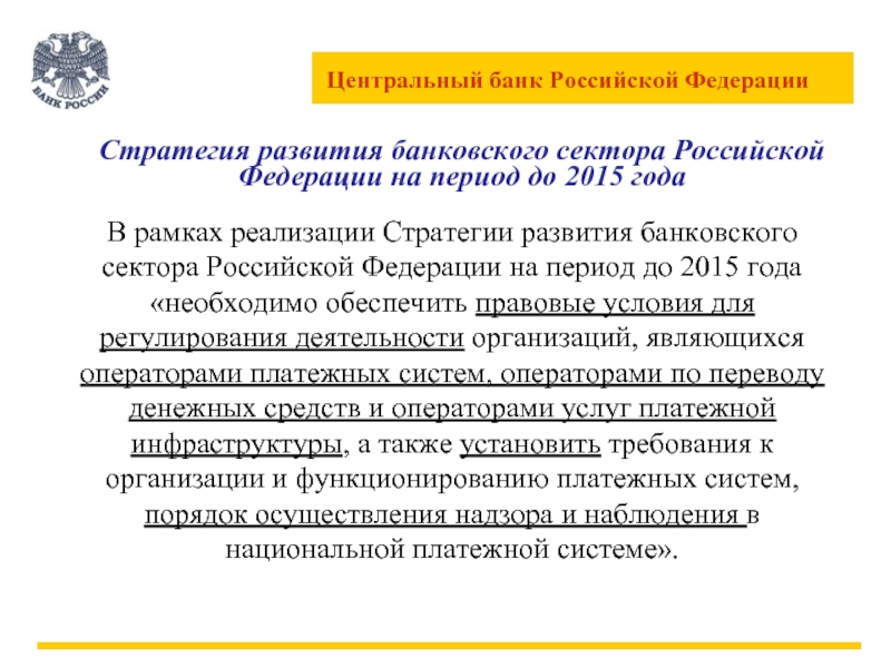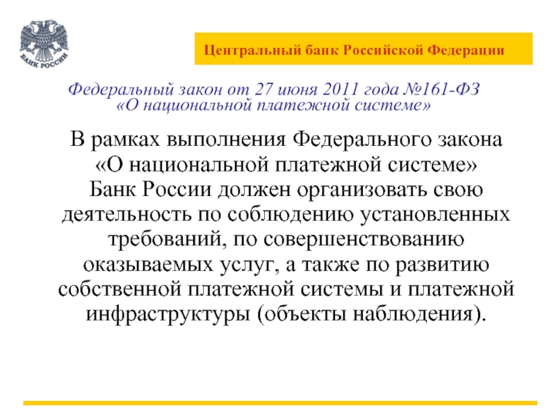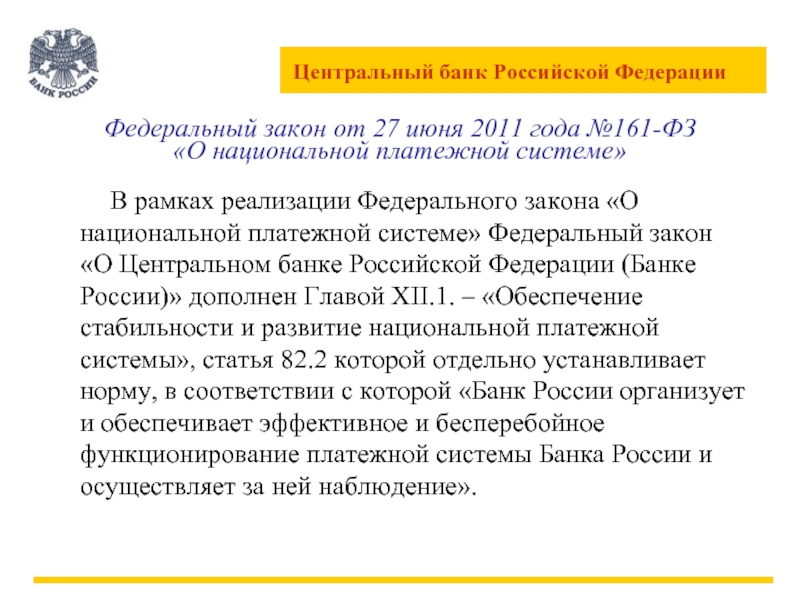 В рамках реализации Федерального закона «О национальной платежной системе» Федеральный закон «О Центральном банке Российской Федерации (Банке России)» дополнен Главой XII.1. – «Обеспечение стабильности и развитие национальной платежной системы», статья 82.2 которой отдельно устанавливает норму, в соответствии с которой «Банк России организует и обеспечивает эффективное и бесперебойное функционирование платежной системы Банка России и осуществляет за ней наблюдение».