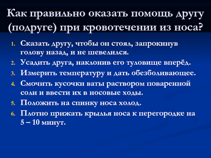 Слайд 9Как правильно оказать помощь другу (подруге) при кровотечении из носа?