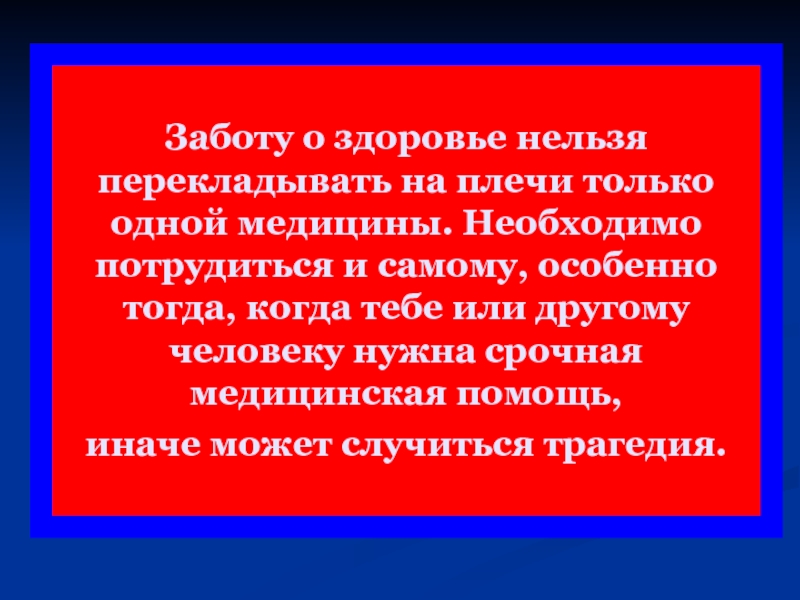 Слайд 5Заботу о здоровье нельзя перекладывать на плечи только одной медицины. Необходимо