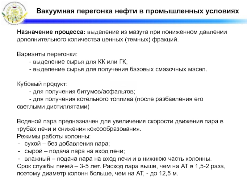 Вакуумная колонна оснащена контуром холодного рецикла («закалки») – для снижения температуры в кубе и предотвращения коксообразования.