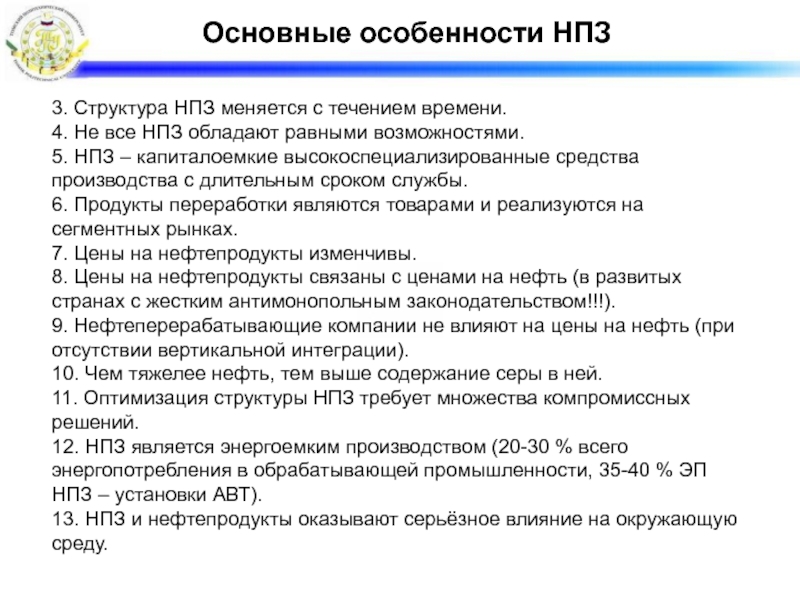 5. НПЗ – капиталоемкие высокоспециализированные средства производства с длительным сроком службы.