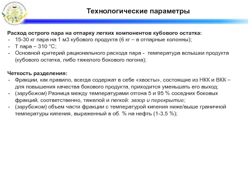 пара на 1 м3 кубового продукта (6 кг – в отпарные колонны);