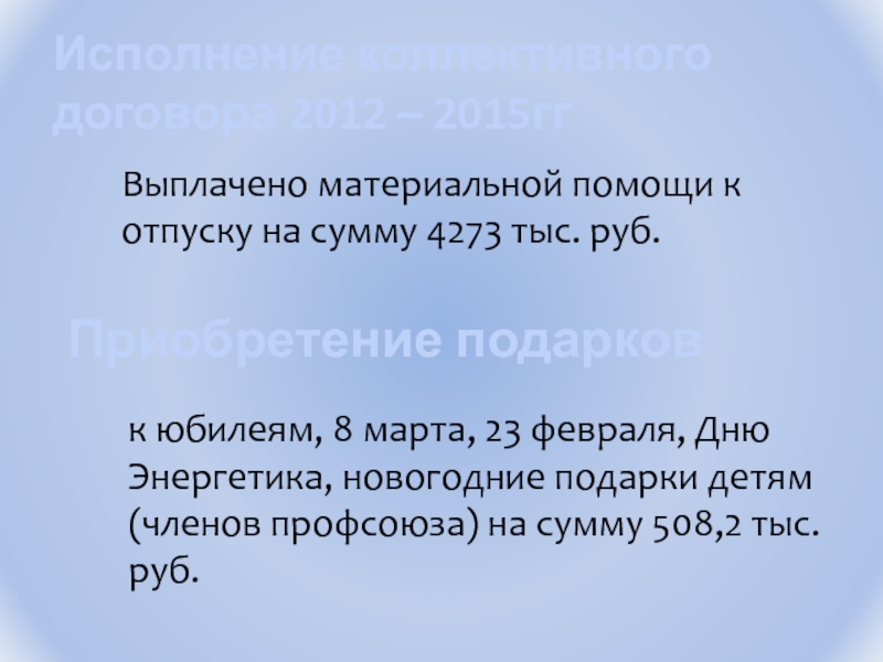 к юбилеям, 8 марта, 23 февраля, Дню Энергетика, новогодние подарки детям (членов профсоюза) на сумму 508,2 тыс. руб.